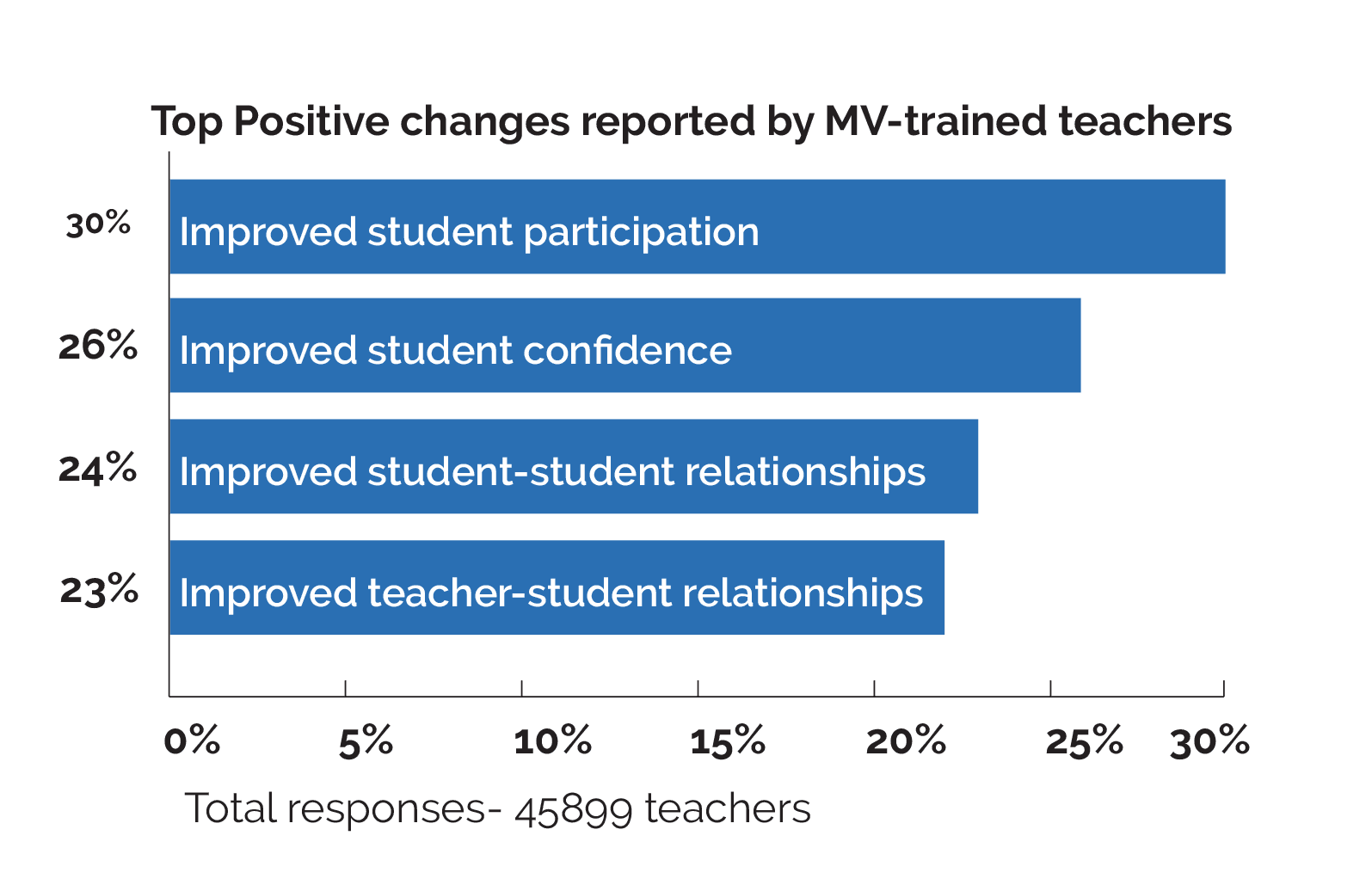 Mulyavardhan's whole-school approach is given a specific direction through certain educational practices that are meant to improve student teacher relationships, promote a feeling of oneness and provide frequent opportunities to achieve learning outcomes. These have been designed to be contextual, seamlessly meld into the curriculum and fit into the regular time table of the school.