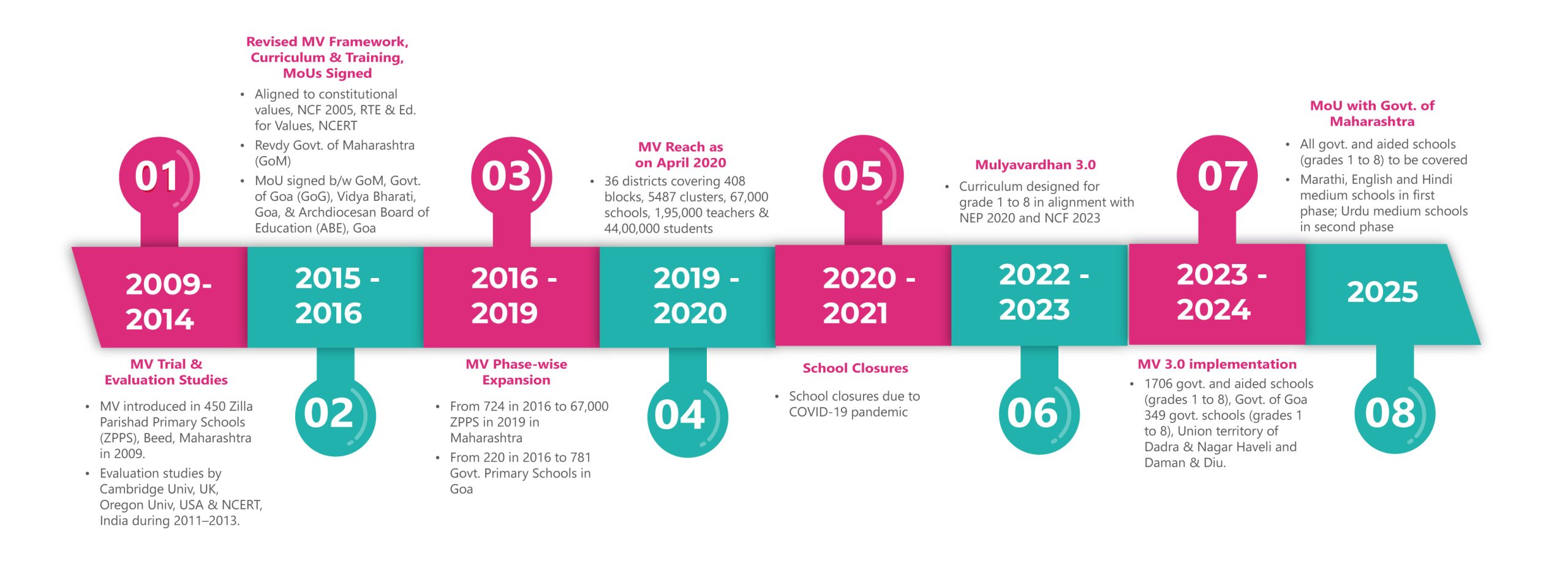 2. Mulyavardhan 1.0 (2009–2015): Pilot phase, Cambridge & NCERT studies conducted.