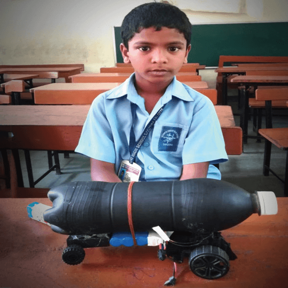 years old. He observed his cousin making a blue torch light and made one on his own. From then on, he would learn through observation. He is most proud of the time he installed a Bluetooth in a mobile phone. His mother, a panch of his village, is really supportive of this hobby. “Even if he gets a brand new toy, he breaks it apart to learn what’s inside,” she had said to his teacher. Whenever Frazer asks for scrap material for his new